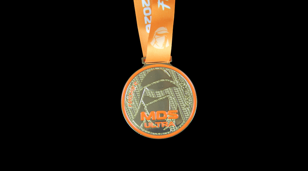 Die Finisher-Medaille des Marathon des Sables Ultra 2026 besteht aus goldfarbenem Metall, ist beidseitig gestaltet und wurde in der Chartreuse entworfen.