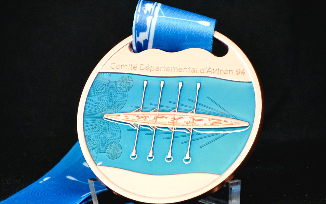 Médaille personnalisée Aviron. Sur une base en métal, la médaille a été élaboré avec de l’émail transparent bleu afin de faire figurer les vagues.
