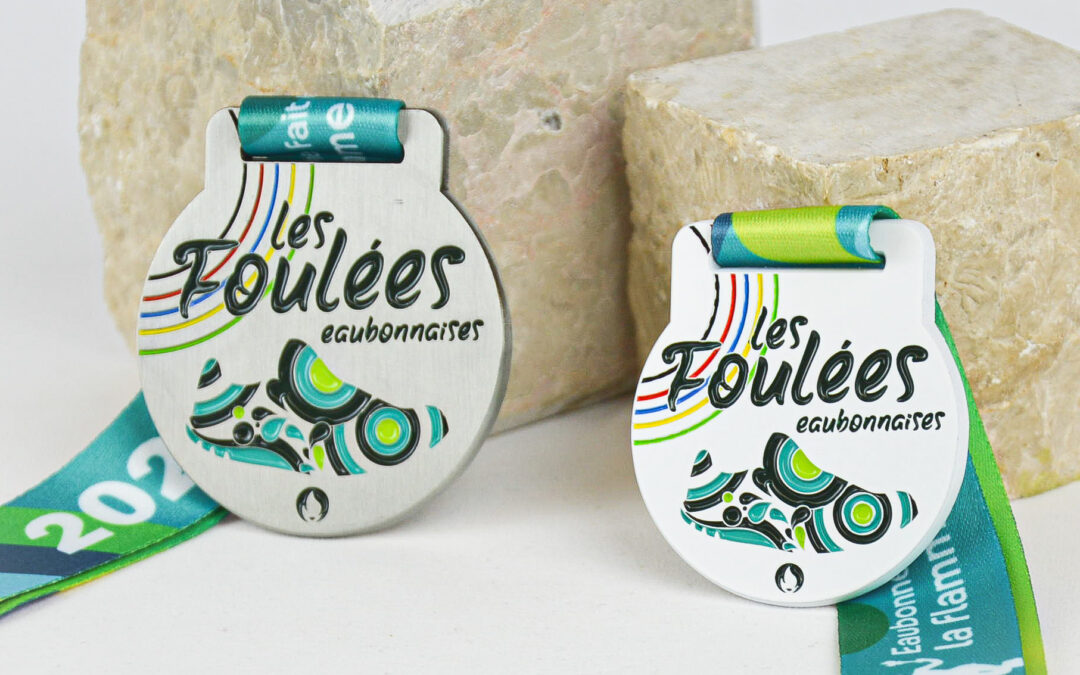 - Un ruban personnalisé, rendant cette médaille unique et parfaitement adaptée aux Foulées Eaubonnaises.