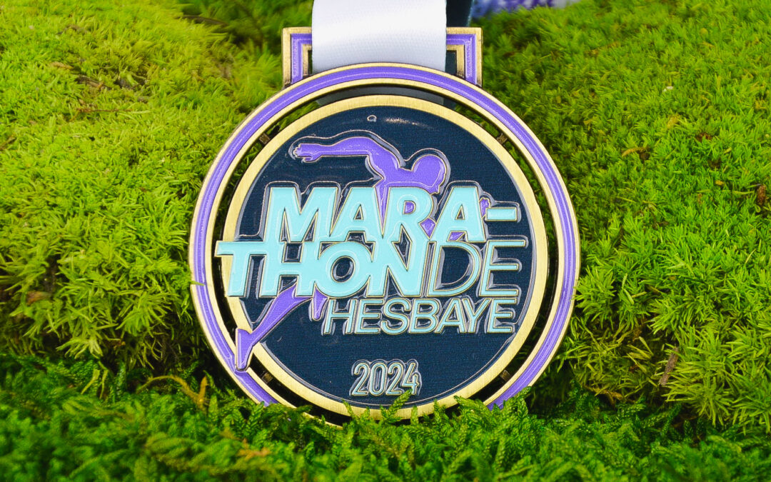 Pour beaucoup, la médaille Finisher du Marathon de Hesbaye est un symbole d’accomplissement personnel. Réalisée en métal, cette médaille a été soigneusement conçue pour capturer l’esprit de la course. Elle reprend avec précision le design de l’affiche de l’événement, le logo du marathon étant sublimé par une impression UV qui conserve les couleurs originales. Cette technique permet de préserver les détails et de refléter l’identité visuelle du marathon avec éclat.