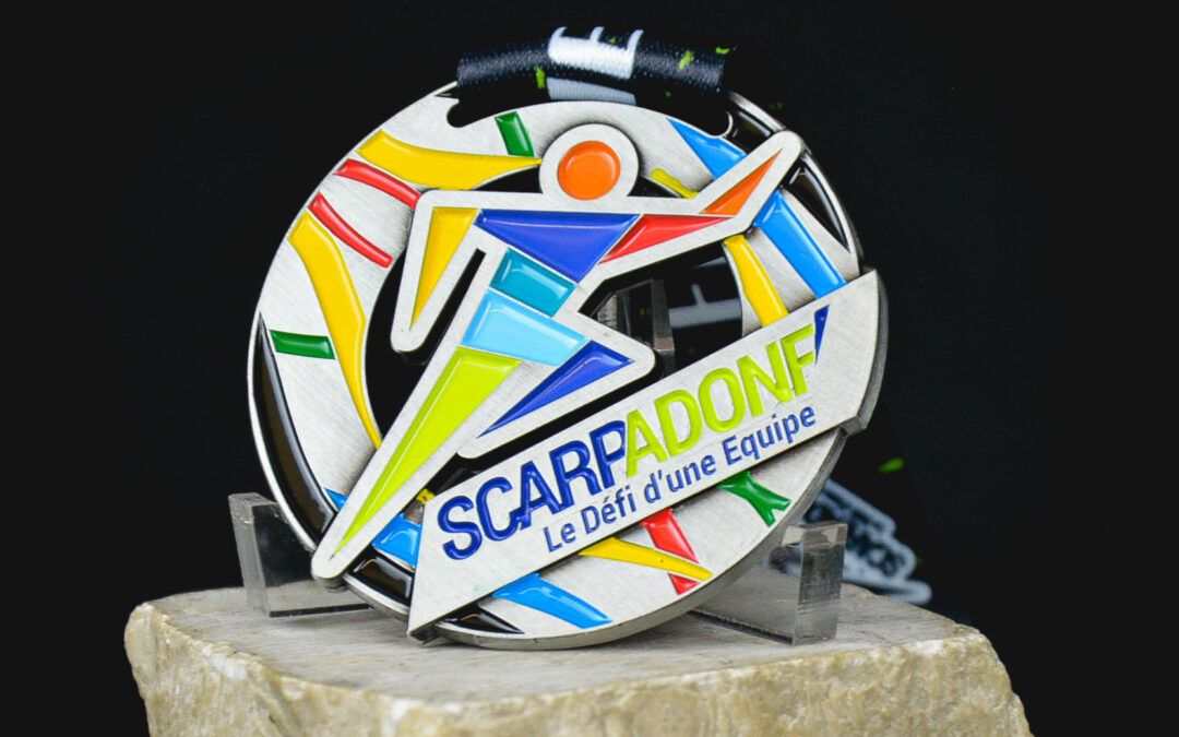 La médaille personnalisée est également un clin d’œil aux couleurs de la Scarpadonf, avec le nom de l’épreuve gravé, offrant ainsi un souvenir unique et durable de cette aventure collective.