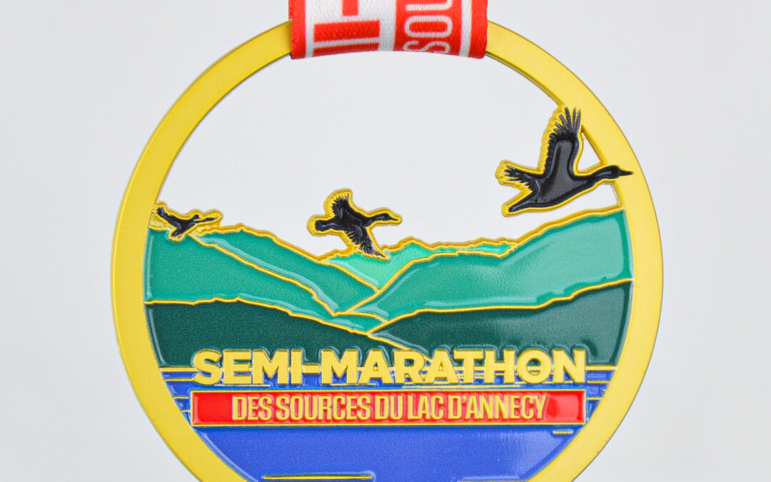 Pour immortaliser cette expérience unique, les finishers reçoivent une médaille personnalisée qui reflète toute la beauté de cet environnement naturel. Cette médaille, réalisée en métal doré, est un hommage à la majesté du Lac d’Annecy et de ses montagnes environnantes. Elle met en avant le lac et les montagnes, symboles forts de cette épreuve, dans un design soigné et coloré grâce à des émaillages représentant les couleurs naturelles du site.