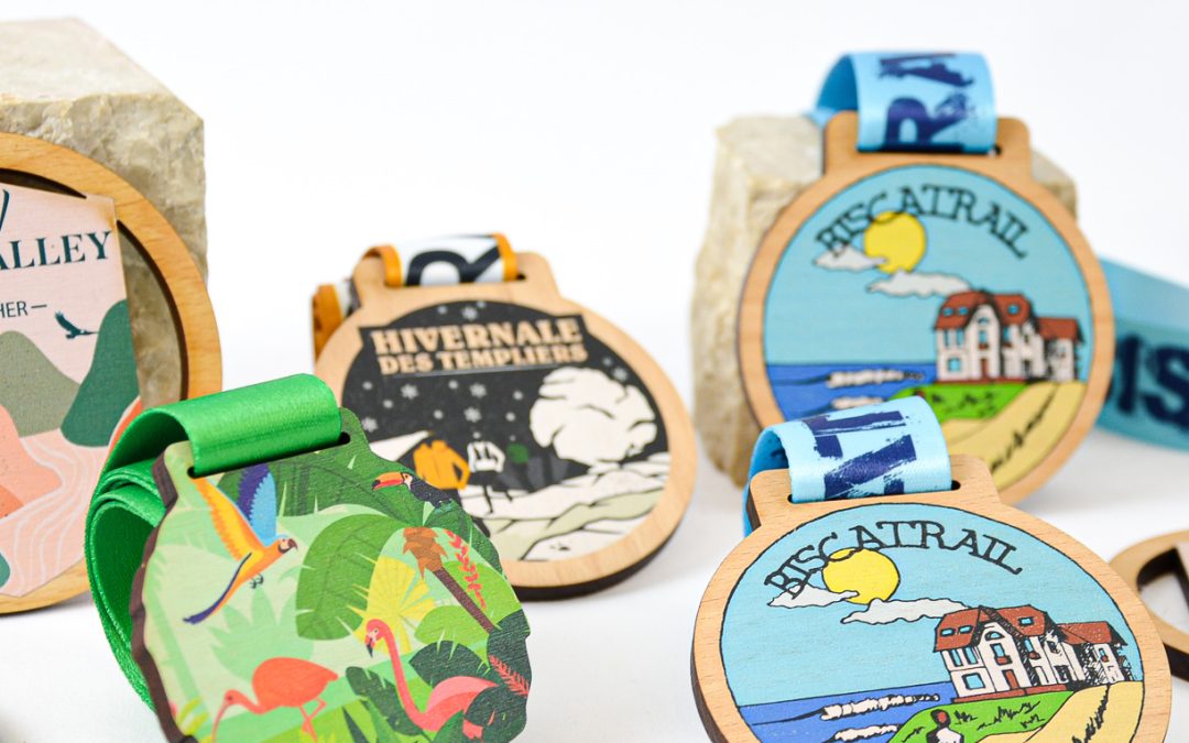 Nous créons désormais des médailles en bois imprimées afin de combiner bois et couleurs. Toujours réalisées à partir de bois de hêtre certifié, la médaille met en valeur le côté éco-responsable.