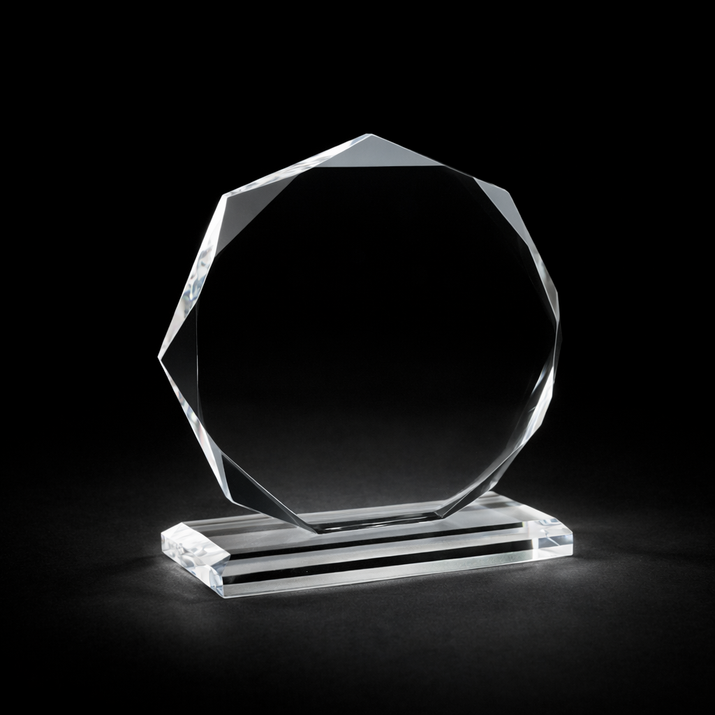 Glastrophäe mit der Möglichkeit, die Trophäe mit Lasergravur (logo und Texte) zu Personalisieren)