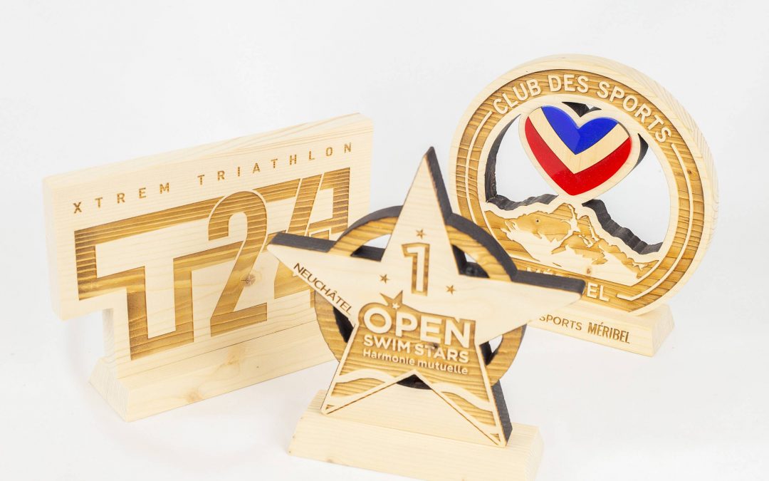 Réalisé à partir de bois de sapin dont notre fournisseur se situe en plein dans le massif de la Chartreuse, nous réalisons la gravure et la découpe de votre futur trophée. Avec l’aide de notre graphiste, nous réalisons une première ébauche de trophée que nous finalisons avec nos différents échanges. De cette manière, le trophée sera parfaitement en adéquation avec l’ADN de votre évènement et selon votre goût.