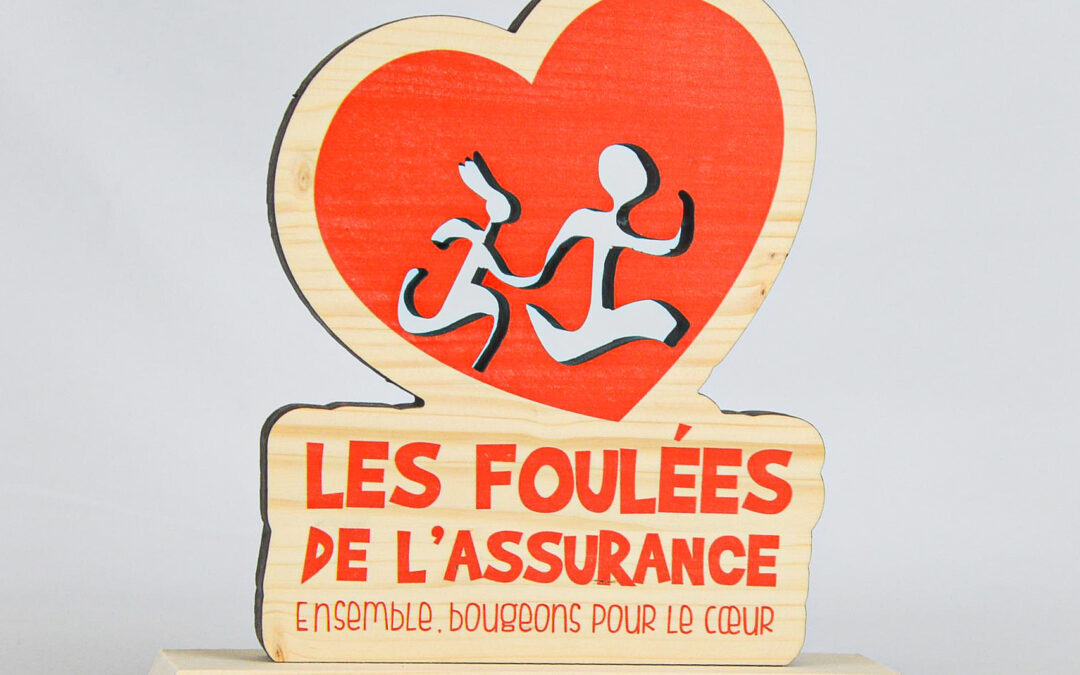 Pour honorer les efforts des participants et célébrer leur engagement, un trophée sur-mesure a été spécialement conçu pour l’événement. Ce trophée unique reprend fidèlement la forme du logo des Foulées de l’Assurance, ainsi que ses couleurs distinctives, grâce à une impression UV de haute qualité. Réalisé en bois, il incarne non seulement la durabilité et l’authenticité, mais aussi l’engagement écologique et responsable de l’événement.