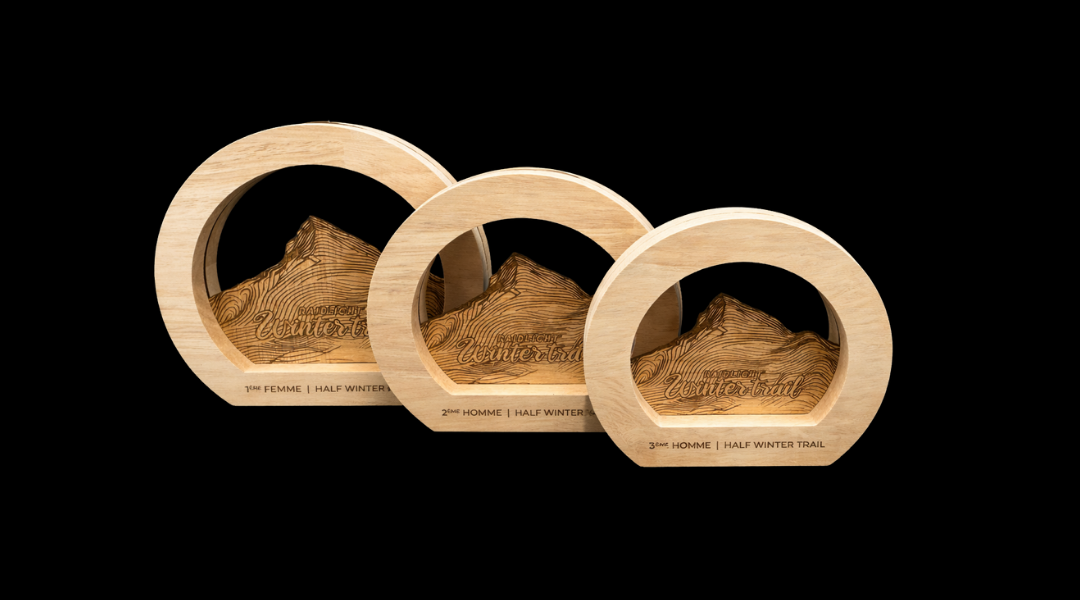 Les trophées en bois récompensent les performances sur chaque distance, tout en offrant un souvenir durable de cette aventure hivernale.