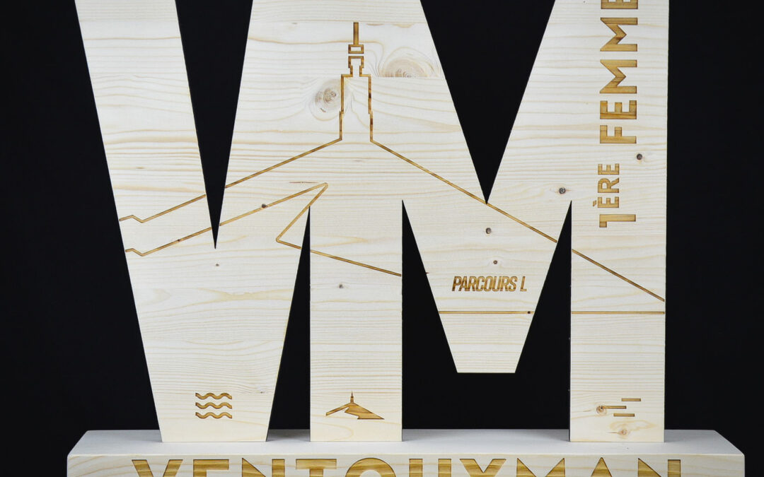 Pour récompenser les vainqueurs de cette épreuve titanesque, un trophée sur-mesure a été spécialement conçu, à la hauteur des efforts fournis par les triathlètes. D’une taille imposante, ce trophée est fabriqué en bois local et réalisé à la perfection grâce à des techniques de découpe et gravure laser. Il reprend les initiales emblématiques du Ventouxman – un V et un M, qui symbolisent à la fois la course et la majesté du Mont Ventoux.