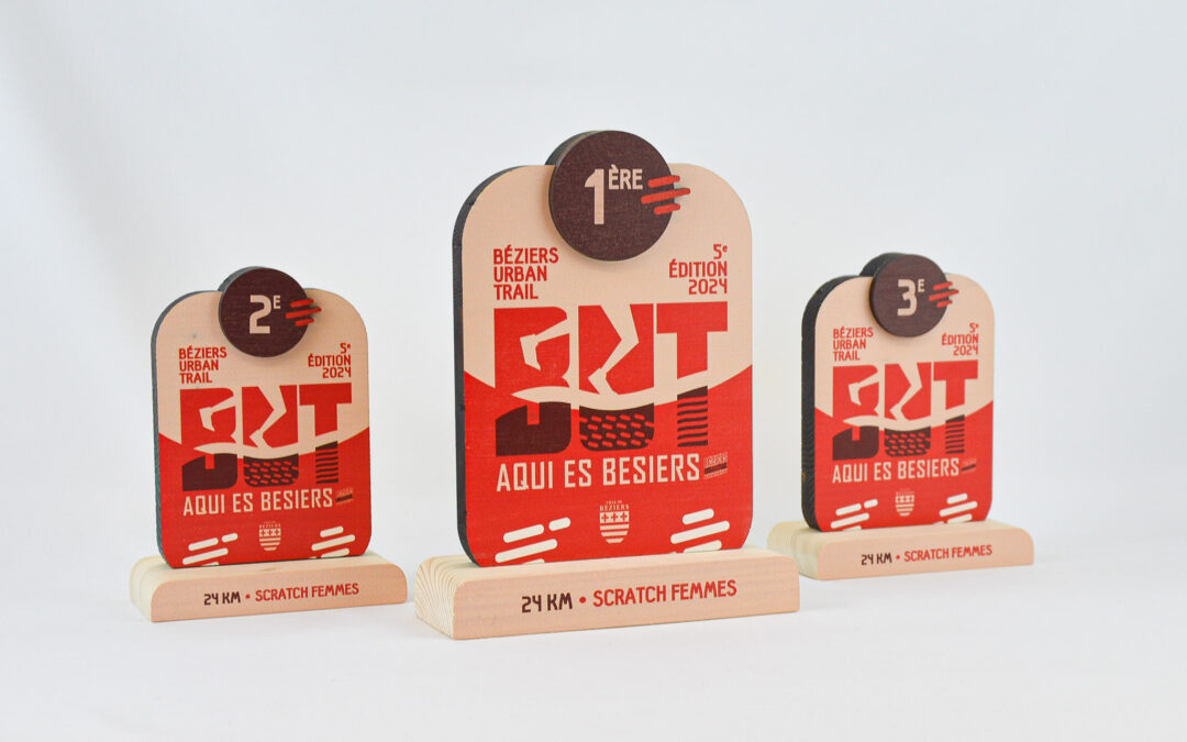 Pour célébrer les performances des meilleurs coureurs de cette édition, un trophée sur-mesure et personnalisé a été spécialement conçu. Inspiré du logo de la course, ce trophée rend hommage à l’identité unique du Béziers Urban Trail et à la richesse historique de la ville.