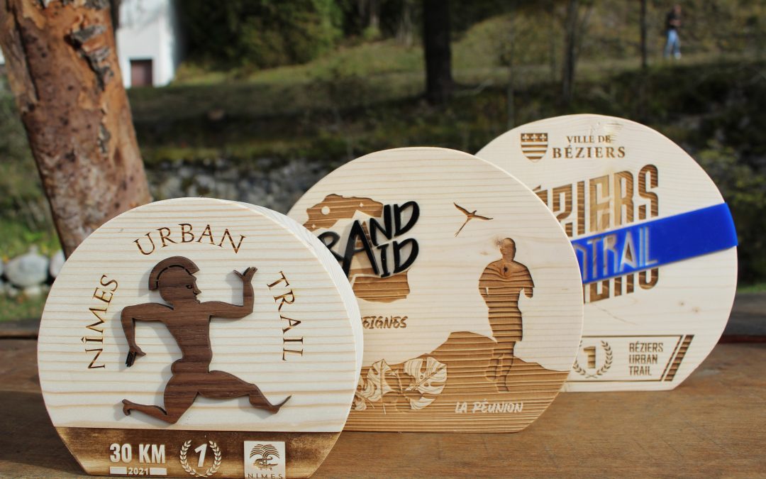 Le trophée en bois gravé est idéal pour donner un caractère éco-responsable à votre course ou votre évènement. IL confère un côté naturel et agréable au toucher. Grace à nos machines laser, nous avons la possibilité de personnaliser le trophée avec de grandes possibilités : logos et textes sans limite. Afin de lui donner encore plus de caractère, il est possible d’ajouter une découpe d’un matériaux comme un bois plus foncé ou du plexiglas. Ce peut être le logo ou une partie du texte qui prend alors forme en 3D.