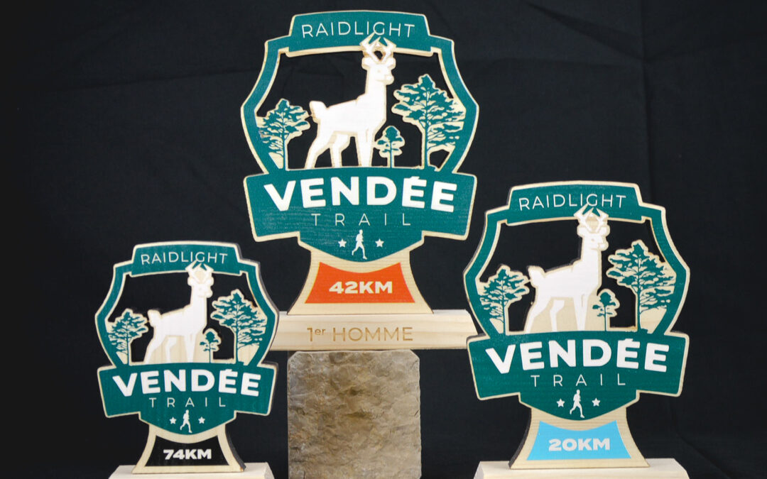 Les trophées sur-mesure du Raidlight Vendée Trail incarnent parfaitement l’esprit de cette compétition. Réalisés en bois et imprimés en UV pour des couleurs éclatantes, ils célèbrent à la fois la performance des athlètes et la beauté naturelle de la Vendée. En offrant ces trophées uniques, le Raidlight Vendée Trail continue de promouvoir des valeurs de dépassement de soi, de respect de la nature et d’engagement environnemental. Les vainqueurs repartiront avec un souvenir précieux de leur exploit, rappelant l’expérience inoubliable de courir à travers certains des paysages les plus magnifiques de la région.